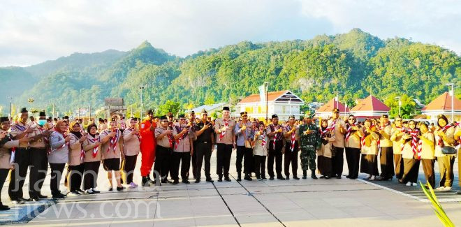 Upacara yang berlangsung di Taman Jokowi-Iriana ini mengusung tema “Pramuka Berjiwa Pancasila Menjaga NKRI.”