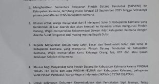 KAIMANANEWS.COM – Pemerintah Kabupaten Kaimana melalui lembar pengumuman Nomor: 400/2.2.2/135/2025 menegaskan, penghentian sementara pelayanan pindah datang penduduk menyikapi rencana pengadaan CPNS Formasi Tahun 2021 Kabupaten Kaimana. Lembar pengumuman yang ditandatangani Sekda Kaimana Drs. Donald R. Wakum mewakili Bupati Kaimana dimaksud, terbit pada 15 September 2025 dan saat ini beredar luas …