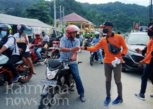 BADAN Penanggulangan Bencana Daerah (BPBD) Kabupaten Kaimana turun ke jalan melakukan pembagian masker gratis kepada masyarakat, Rabu (28/7/2021). Upaya ini dilakukan untuk mengingatkan masyarakat Kaimana bahwa Corona Virus Disease 2019 (Covid-19) masih mengancam kehidupan manusia.