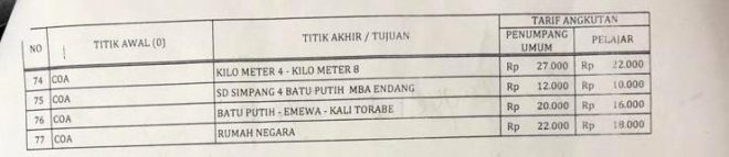 Kepala Bidang Perhubungan Darat Dinas Perhubungan Kabupaten Kaimana, Habel Egana, S.Sos saat dikonfirmasi menjelaskan, tarif yang disepakati ini merupakan jalan tengah yang diambil Dinas Perhubungan dan organisasi ojek setelah melihat batas atas dan batas bawah tarif penumpang.