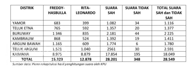 Adapun perolehan suara per distrik yang diraih kedua pasangan calon berdasarkan hasil rekapitulasi penghitungan suara yang telah dilaksanakan mulai dari tingkat KPPS, PPD hingga penetapan oleh KPU adalah sebagai berikut;