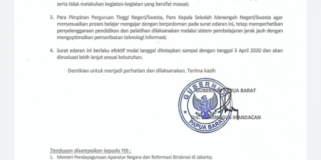 SEKRETARIS Daerah Kabupaten Kaimana secara resmi menerbitkan surat pemberitahuan kepada seluruh Pimpinan OPD untuk menindaklanjuti surat edaran Gubernur Papua Barat terkait pencegahan Covid-19. Sekda Rita Teurupun melalui surat pemberitahuan Nomor: 850/241/III/SETDA/2020 tanggal 18 Maret 2020 meminta seluruh pimpinan OPD untuk menjalankan 4 poin yang tertera dalam surat edaran Gubernur Papua …