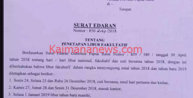 KAIMANA- Gubernur Papua Barat melalui surat edaran Nomor: 850/2167/2018 yang ditujukan kepada Bupati/Walikota, Sekda, Para Kepala OPD, Pimpinan BUMN, BUMD dan Pimpinan Instansi Vertikal di Provinsi Papua Barat resmi menetapkan hari libur Fakultatif Natal dan Tahun Baru. Dalam surat edaran tertanggal 7 Desember 2018 yang telah beredar di media sosial …