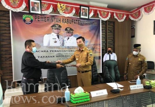 BERTEMPAT di Ruang Rapat Kantor Bupati Kaimana, Senin (3/5/2021), Bupati Kaimana Freddy Thie didampingi Wakil Bupati Hasbulla Furuada, melakukan penandatanganan kesepakatan atau Memorandum of Understanding (MoU) dengan Yayasan Apostolos Papua untuk pendirian sekolah multimedia di Kaimana.