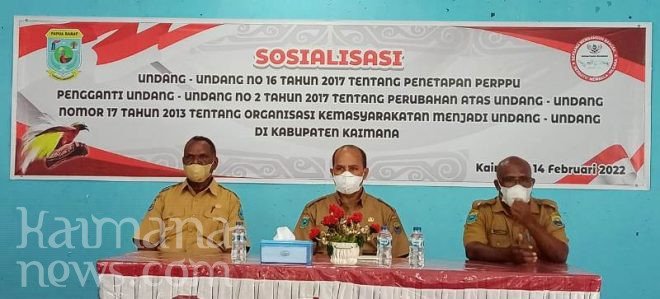 KAIMANANEWS.COM- Badan Kesatuan Bangsa dan Politik Provinsi Papua Barat bekerjasama dengan Kantor Kesbangpol Kabupaten Kaimana menggelar Sosialisasi Undang-Undang Nomor 16 Tahun 2017 tentang Penetapan Perppu Nomor 2 Tahun 2017 tentang Perubahan Atas Undang-Undang Nomor 17 Tahun 2013 tentang Organisasi Kemasyarakatan Menjadi Undang-Undang, Selasa (15/2/2022).