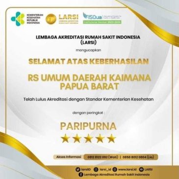 Sertifikat akreditasi yang diterima RSUD Kaimana dengan Nomor: LARSI/SERTIFIKAT/277/01/2024, ditandatangani oleh Ketua Umum Larsi, dr. Umi Sjarqiah, SP, KFR, MKM, FISQUA dan disahkan oleh Direktur Pelayanan Kemenkes RI dr.Azhar Jaya,S.H,SKM,MARS, dan berlaku sampai 4 Januari 2028.