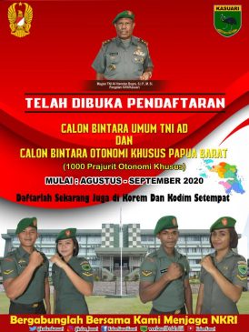 Dikatakan, pendaftaran calon bintara ini untuk wilayah Kaimana dilaksanakan di Mako Kodim 1804, Kilo II Jalan Batu Putih. Pendaftaran sendiri dijadwalkan hingga akhir September 2020.