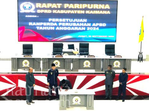 Berita acara persetujuan dan surat keputusan ditandatangani Ketua Sementara DPRD Kaimana, Robby Daud Samangun dan Wakil Ketua Sementara, Emanuel Rahail, serta Bupati Kaimana, Freddy Thie pada penutupan Rapat Paripurna DPRD, Jumat (20/9/2024) malam.