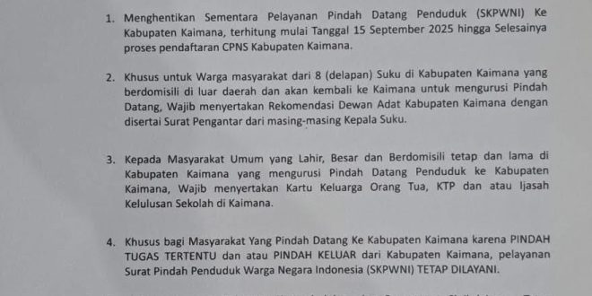 KAIMANANEWS.COM – Pemerintah Kabupaten Kaimana melalui lembar pengumuman Nomor: 400/2.2.2/135/2025 menegaskan, penghentian sementara pelayanan pindah datang penduduk menyikapi rencana pengadaan CPNS Formasi Tahun 2021 Kabupaten Kaimana. Lembar pengumuman yang ditandatangani Sekda Kaimana Drs. Donald R. Wakum mewakili Bupati Kaimana dimaksud, terbit pada 15 September 2025 dan saat ini beredar luas …