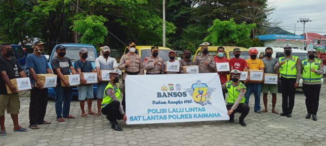 KAIMANANEWS.COM – Satuan Polisi Lalu Lintas Kepolisian Resor (Polres) Kaimana membagikan bingkisan bantuan sosial kepada sopir truk dalam rangka memperingati Hari Ulang Tahun Polisi Lalu Lintas ke-67 tahun 2022.